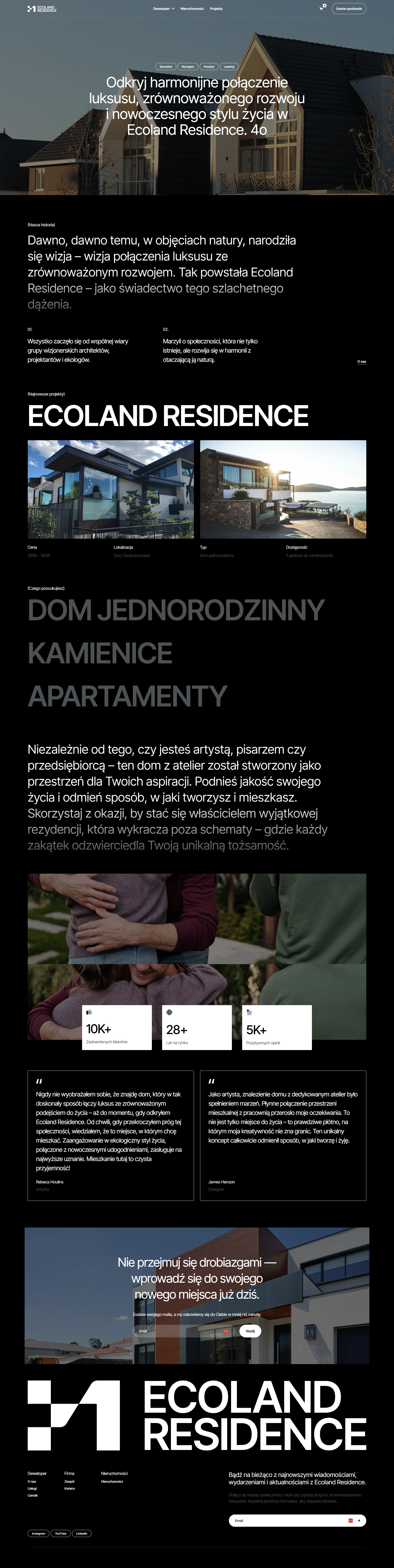 Nowoczesna strona dla dewelopera nieruchomości premium, łącząca elegancki design z funkcjonalną wyszukiwarką inwestycji. Projekt oddaje luksusowy i ekologiczny charakter marki, ułatwia klientom odnalezienie idealnego domu i zapewnia intuicyjne doświadczenie użytkownika na każdym etapie przeglądania oferty.